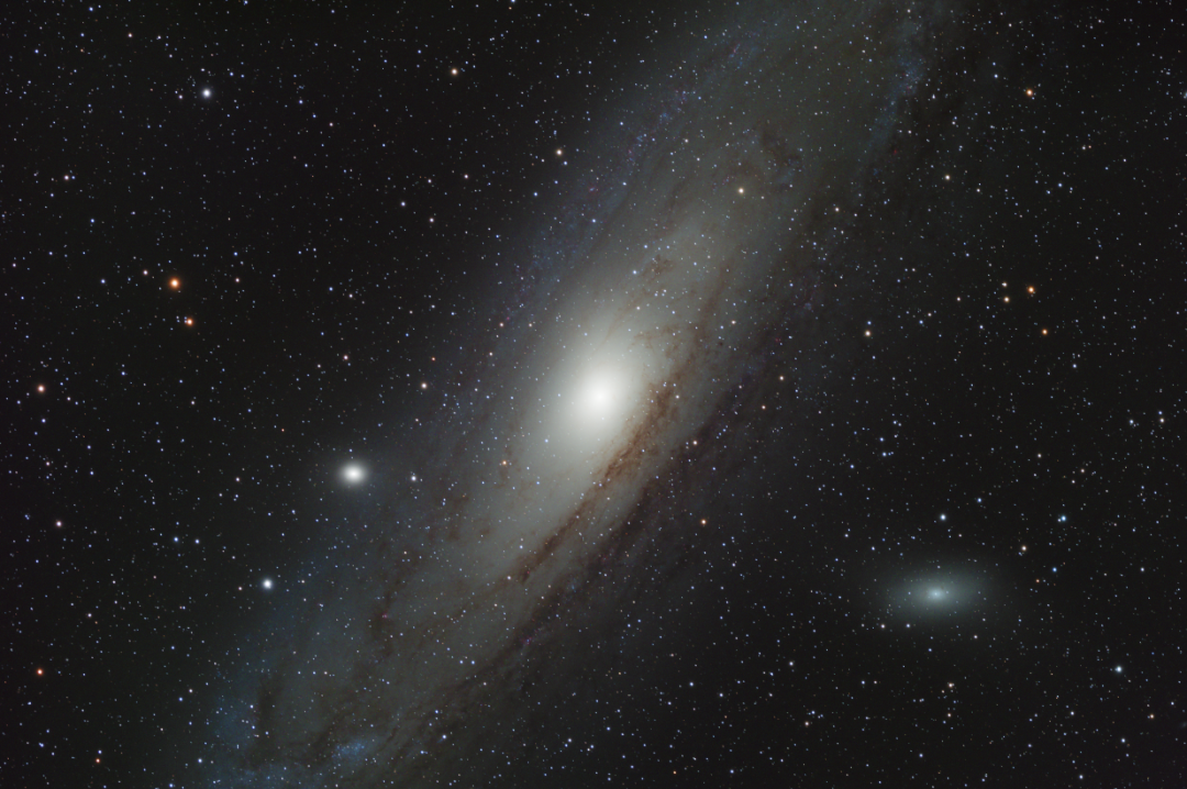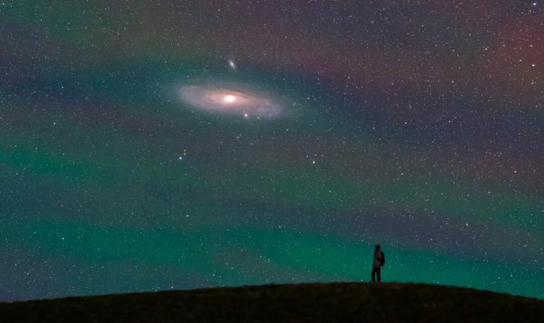 当罕见的波纹状气辉爆发在乌兰察布的天空时,我正仰望着M31仙女星系,这也许是夜空中我们肉眼所能见到的最古老的光,它跋涉了250万光年的距离才到达我们的眼球,而和它交织在一起弥漫整个天空的气辉是离我们百公里高层大气的暗淡光芒。M31仙女星系包含着一万亿颗恒星,在它的上方是它的伴星系M110,许多人认为,我们的银河系在未来的四十多亿年后与M31碰撞并合并。
