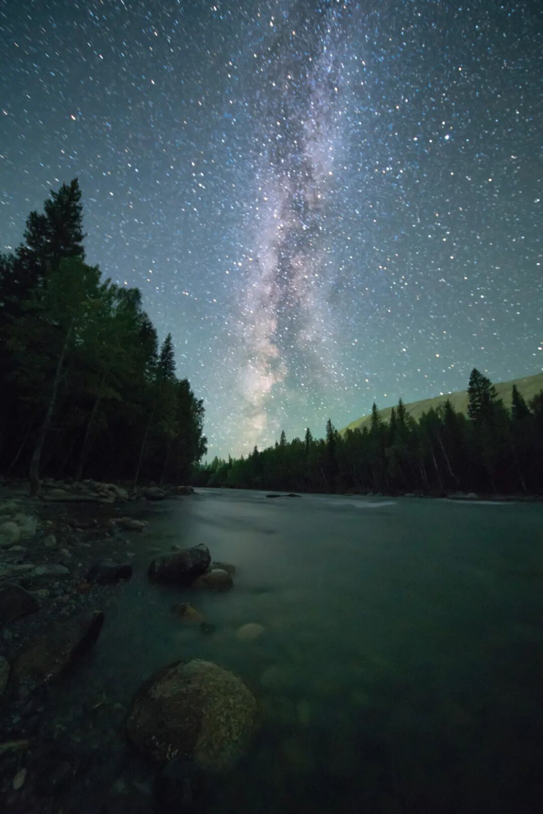 凌晨2时,银河心已升至禾木河上方,绚丽的星光照亮了河谷。