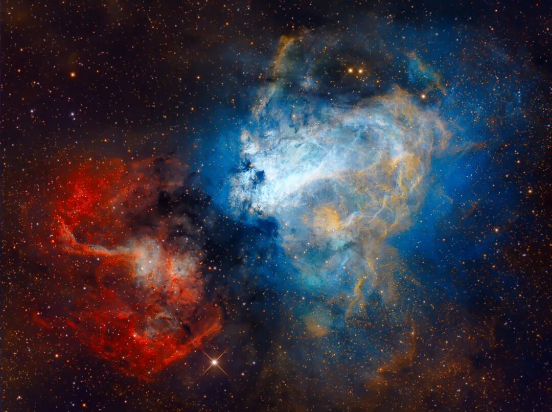 在神秘的宇宙深处,银河中心附近人马座的电离氢区域,有着这样一片空间。M17,又称欧米茄星云、天鹅星云、马蹄星云等,借助于SHO窄带滤镜,我们得以观察到他的另一幅面貌。图片中红与蓝产生强大的视觉冲击力,就像冰与火的战争。