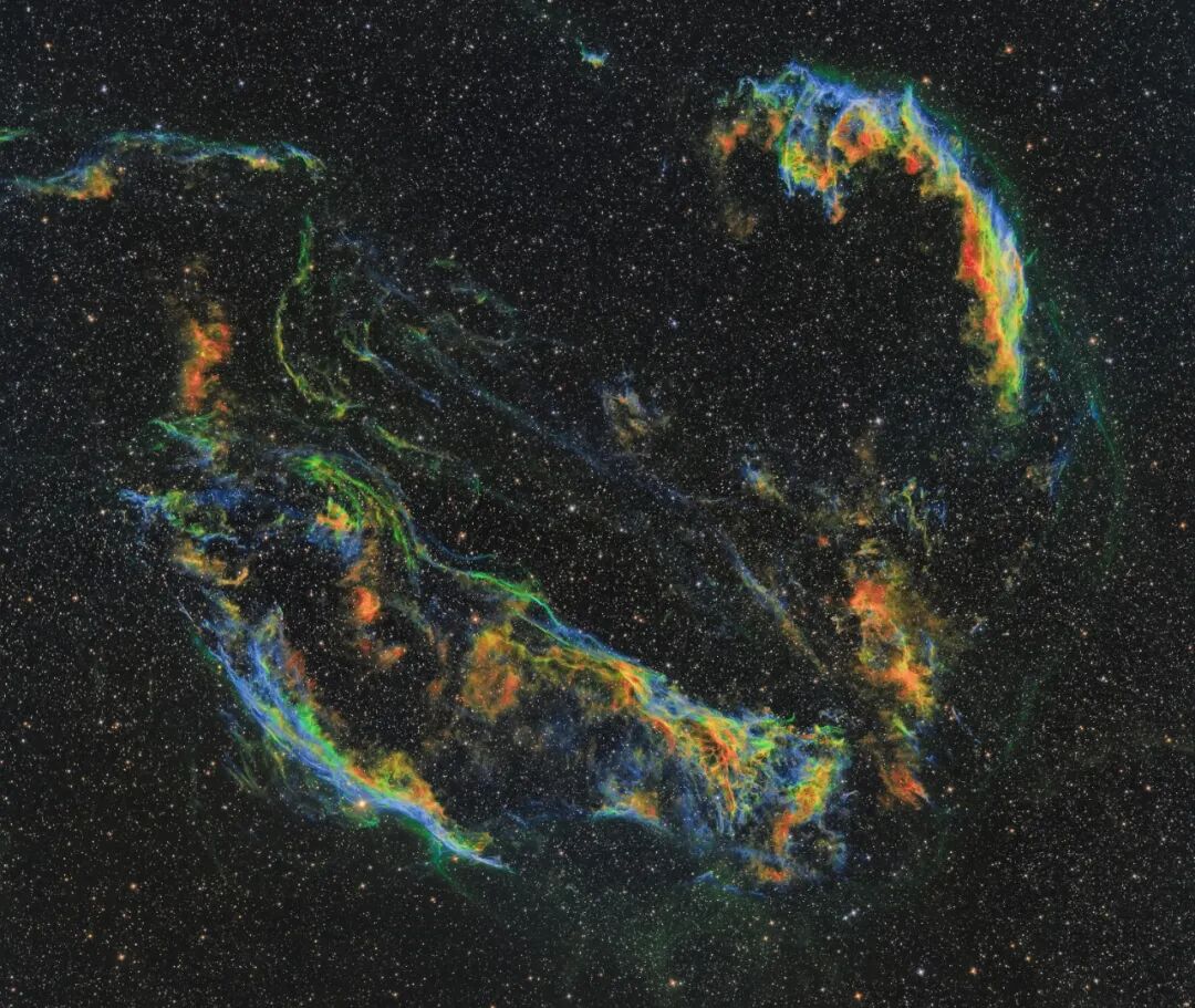 面纱星云的视角跨幅将近3度,大约是满月直径的6倍。以它约1,500光年的距离来估算,这片星云涵盖了超过70光年的区域。它的多个明亮云气区同时还拥有各自的别名,诸如万圣节面具(东面纱,右上)、女巫扫帚星云(西面纱,左下)、皮克林三角、弗莱明三角(右下)还有一些不知名的暗弱尘埃云。