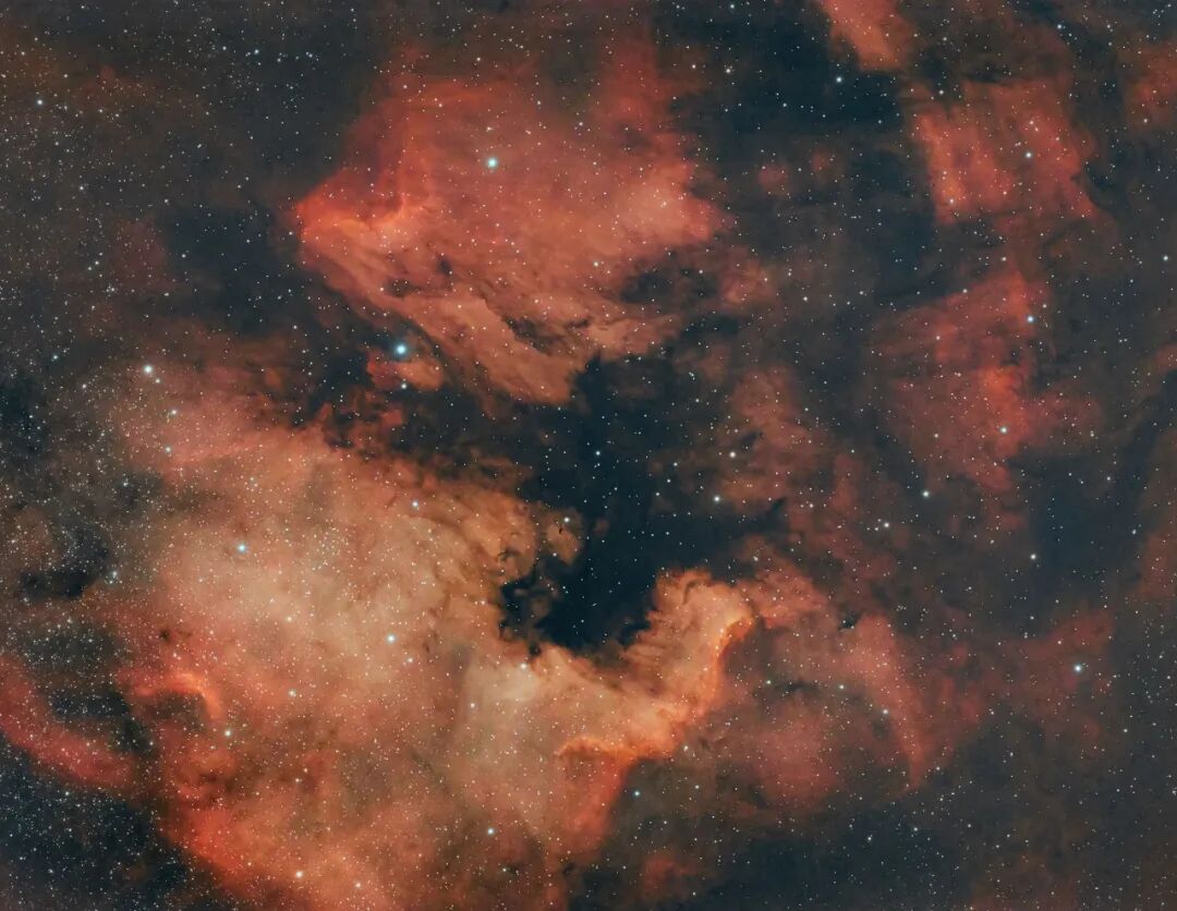 位于天鹅座的NGC7000北美洲星云,是一个电离氢发射星云。因其形状与北美洲东南区域板块十分相似而得名。