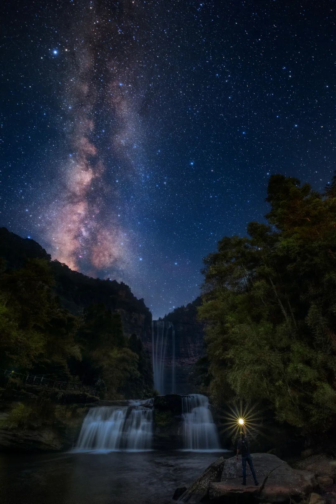 四面山的望乡台瀑布高158米,宽48米,被称为华夏第一高瀑,是四面山景区最壮观的瀑布,主瀑布下方还有阶梯状的小瀑布,趁银河竖上山头的时机,在瀑布脚下来一张与瀑布银河的合影,完成了我多年来的心愿。
