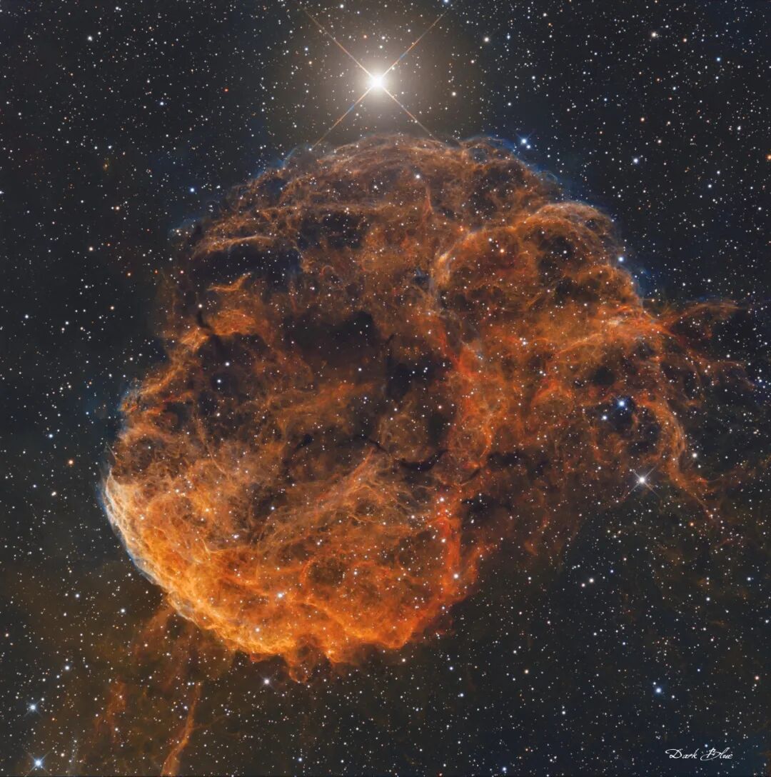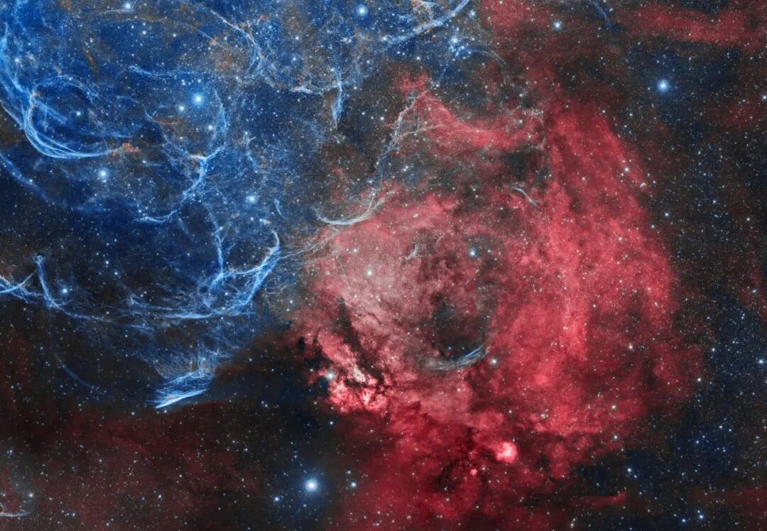 细长的外形暗示了它的俗名——铅笔星云。铅笔星云长约5光年,距我们800光年,它只是船帆座超新星遗迹的一小部分。船帆座超新星遗迹的直径约为100光年,是一颗在大约11000年前爆炸的恒星碎片不断膨胀形成的。最初,冲击波以每小时数百万公里的速度移动,然后席卷了周围的星际物质,速度大大减慢。在这幅窄带大视场图像中,红色和蓝色分别主要表示了电离的氢原子和氧原子的特征发光。