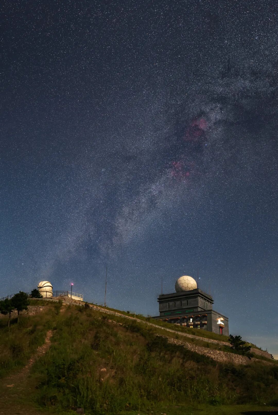 半夜12点左右,月亮慢慢升起,天空变成了蓝色,在月光的照耀下,天文台清晰可见,银河尾巴也成45度浮现在天文台之上。