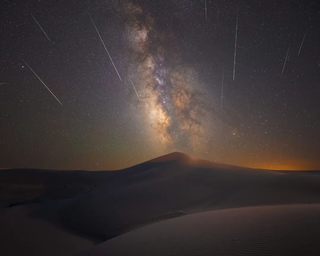 8月13日下午一路驱车躲避着满天的晚霞,回到摘星小镇附近,找到一处如肌肤一般干净的沙丘,拍摄银河方向的英仙座流星雨,数量虽不如极大值夜晚,但是亮度和长度尤为过之。