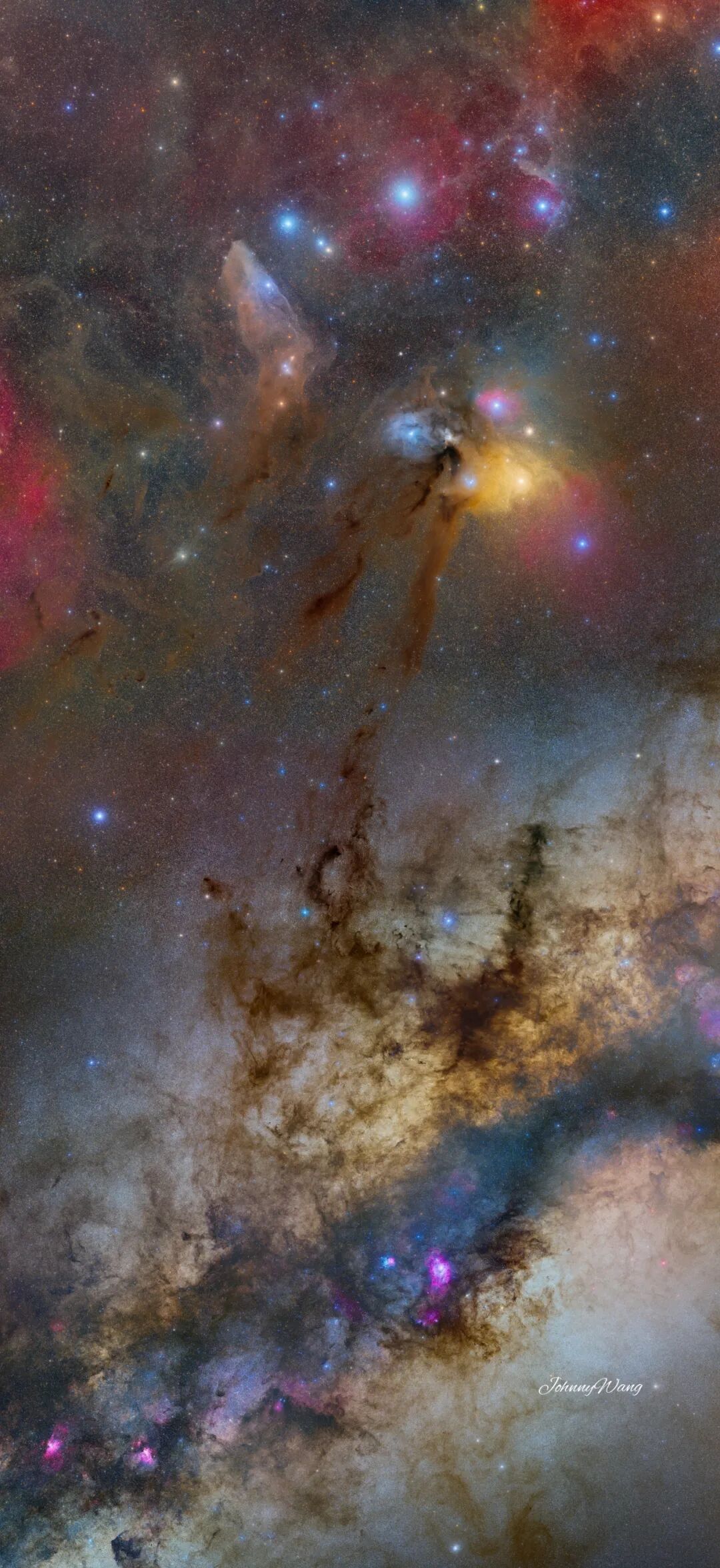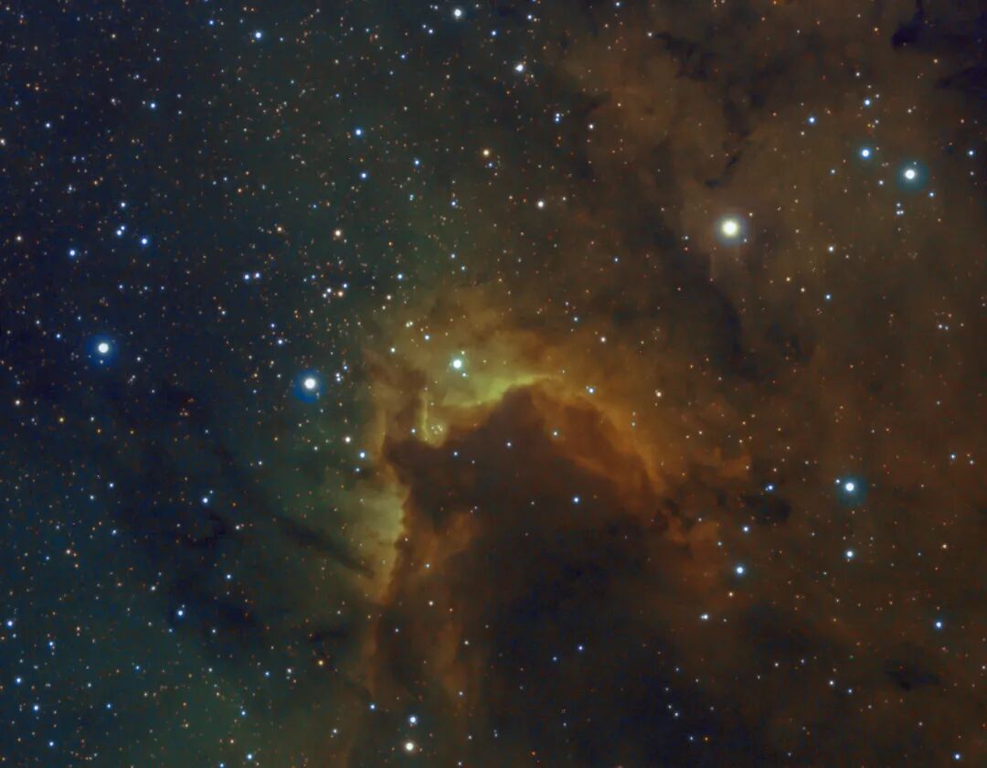 编号为SH2-155的洞穴星云 (Cave Nebula), 是位于仙王座内的一个包含发射、反射和暗星云的复杂结构,这个星云的名称得自于它的外观,通过长时间曝光得到的窄带合成图像,犹如一幅浓墨重彩的山水画,“山洞”部分位于图中显著位置,令人印象深刻。