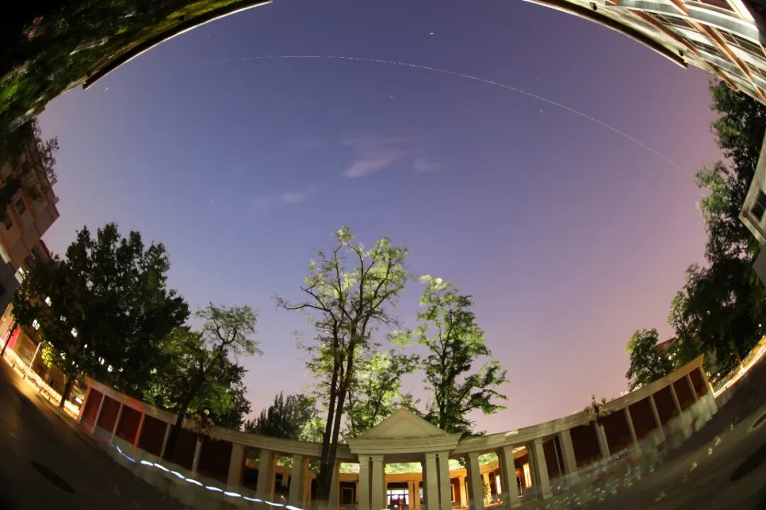 今天天宫过境角度比较高,大约84°,去爸爸办公室,使用8-15 的鱼眼镜头,以便收入更多的地景和确保全程记录天宫过境过程。过境时间是民用昏影的临界,地景选择爸爸办公室大学校史馆建筑。利用好相机参数,基本全程记录下天宫过境国成。且此次过境线路,正好穿越夏季大三角。构成了完美弧线。