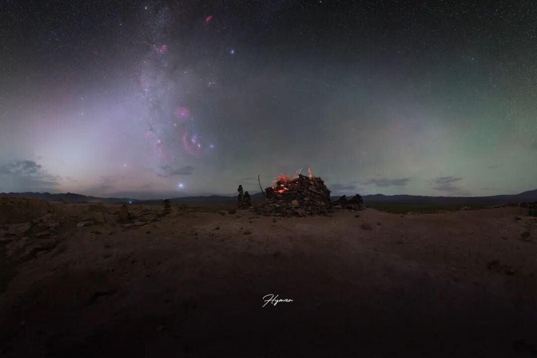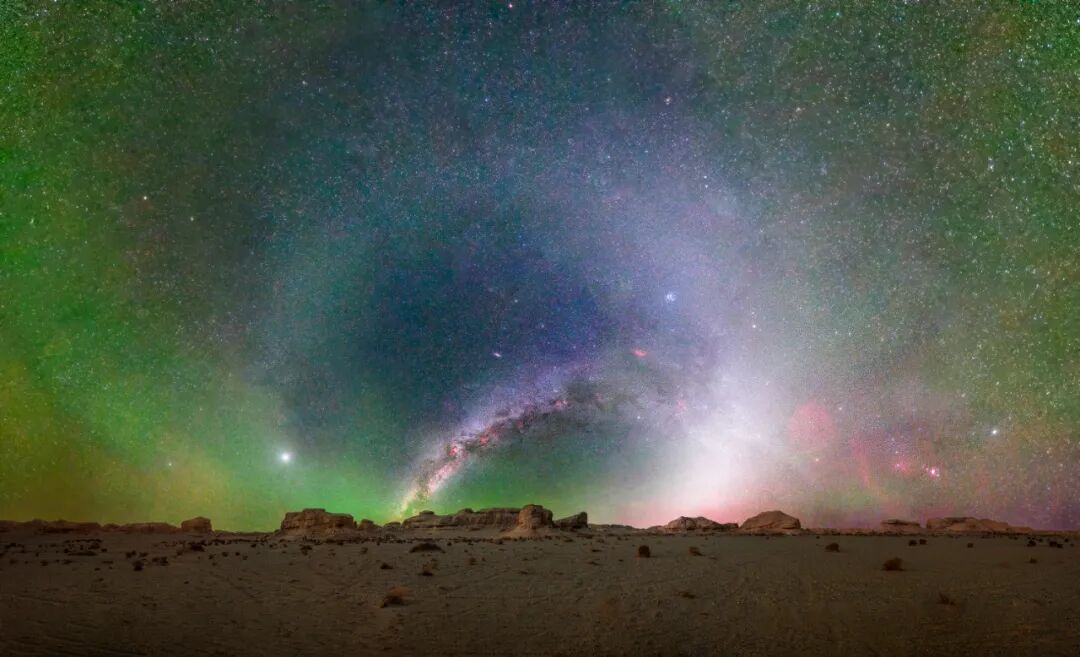 英仙座流星雨行程拍摄的最后一天,云层散尽,气辉在雅丹上空翻腾,四天的长途奔袭,白日酷暑,夜寒难耐,拖着疲惫的身躯在天文晨光始前一个半小时无意中记录下了这幅画面。图中的白色光环并不是人类活动产生的光污染,而是一种奇特的天文现象:黄道光。每当北半球春季日落后和秋季日出前,太阳光经过星际尘埃的散射。在良好的观测环境下可以分别在夜空的西侧和东侧看到由地平线向上沿黄道面升起的锥形光线,这就是黄道光。画面中靠近左侧地平面的两颗亮星分别为即将沉入地平面的土星和木星,中间为反向银河拱桥,右侧的红色发射星云则为刚刚升起的猎户座。我通过全景接片的拍摄方法,采取了特殊的投影方式,使得全天夜空呈方形投影在画面中。夏季银河渐落,而冬季银河渐升,四季银河呈现在同一片夜空,太阳的光芒也环绕于天地之间,是一种难以名状的震撼。