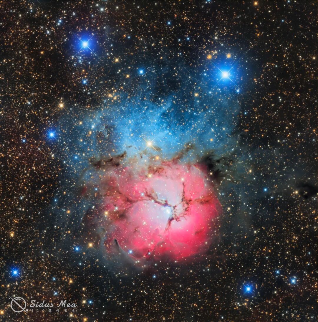 三叶星云又称为三裂星云,是位于人马座的发散和发射混合型星云,她距离我们5000光年,位于银河系盘面的一个恒星形成区;它由红色、蓝色发射星云以及密集的尘埃云组成了醒目又紧凑的三部分,故被称为三叶星云。