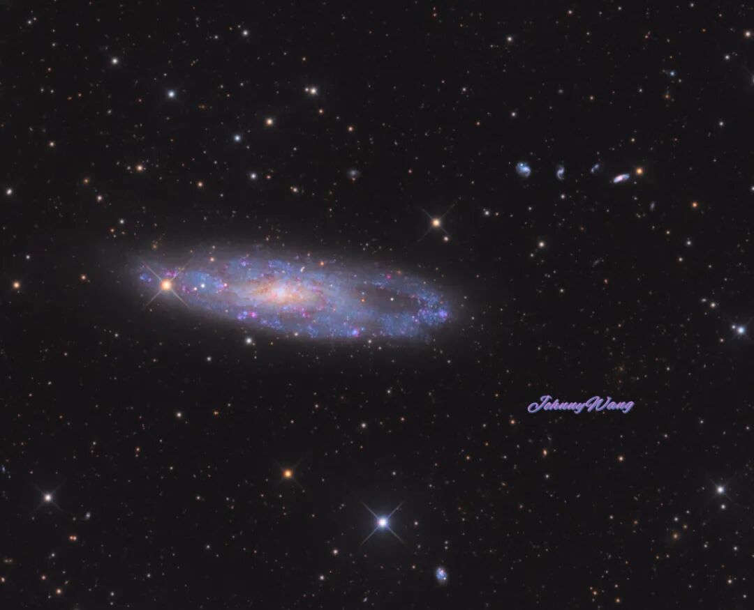 雕刻家星系离我们约1100万光年,不过更神奇的是在它旁边的四星系串,称为伯比奇链,它们离我们约3亿光年远。就像一个大星系妈妈,带着4个孩子,在宇宙中游弋。