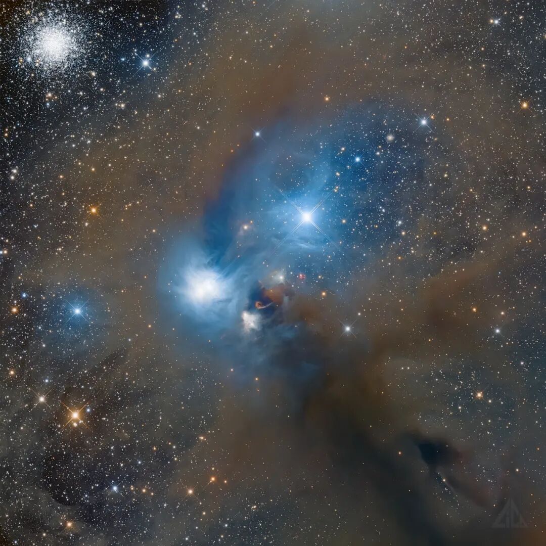 南冕座R星云距离我们约500光年,位于南冕座的北缘,是一个被恒星点亮的尘埃云。它特有的蓝色色泽来自被尘埃反射的炽热恒星光。