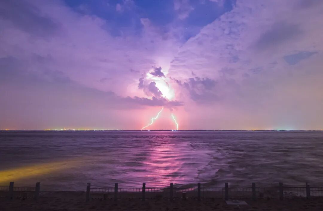每逢农历十五,钱塘江大潮时刻,岸边观潮人群涌动,作者在浙江嘉兴钱塘江畔巧遇雷暴云,利用慢门手法,拍到这张满意的闪电,两道闪电直冲地面,就像是巨兽的两只脚,而雷暴云两侧上方的彩云,恰似一对巨大的翅膀。整体看去,就像是一只巨兽站在夜空中。