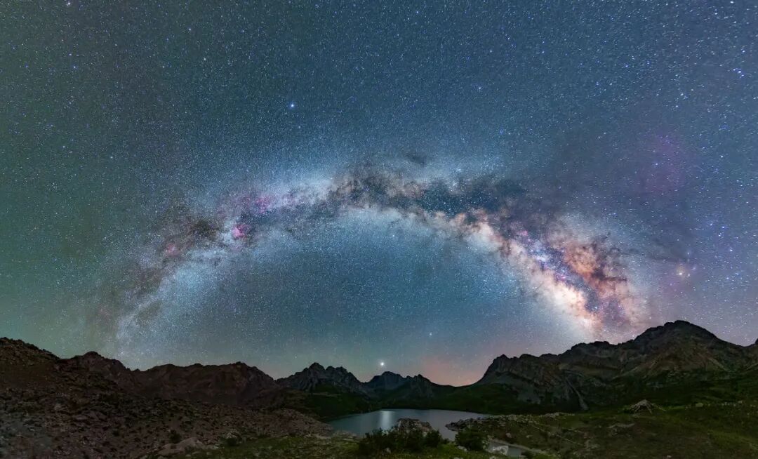 横跨高原湖泊的银河之拱,初升的木星显得格外明亮,将它的光倒映在湖水中。