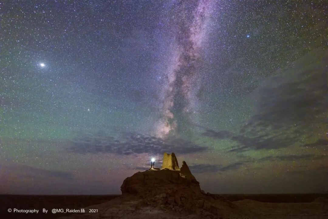 在前往敦煌雅丹魔鬼城拍星的戈壁上,发现了这个发射推进器的残骸,猜想是最近一次航天实验所留。近年来祖国的航天事业繁荣昌盛,去年我们发射了自己的火星探测器,今年我们的天和号核心舱成功对接,天舟号货运飞船成功对接,6月我们还发射了神舟十二号载人飞船……想到这里于是拿出了小“祝融”拍下了这张合影,一起遥望星空,祝愿“祝融号”未来的巡火之旅顺利,星河璀璨,奥秘无穷,希望未来有更多的探测器踏入广袤深空,去探索宇宙奥秘。