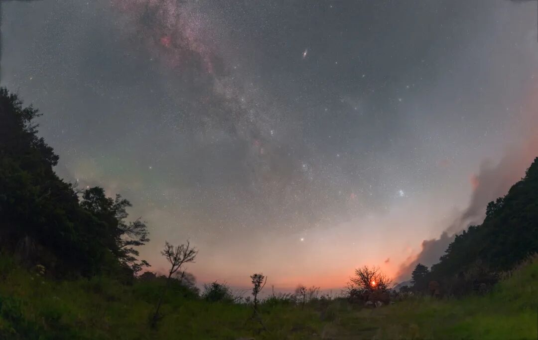 在夏季的尾巴,我独自矗立在一个小山丘上,让漫天星光充盈双眸,我能清晰地辨认出那高悬天边的银河、仙女星云、面纱星云和昴星团……直到新月初升,红光撒满山谷,才心满意足结束这次观星之旅。