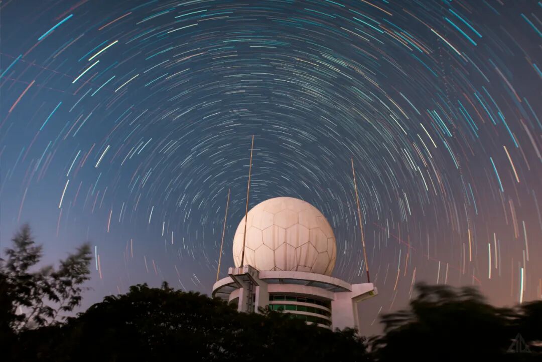 位于市区附近高山上的柳州国家气象观测站。入夜后,虽然在市区6级强光污染下看不到银河的身影,但是依然有璀璨的繁星。