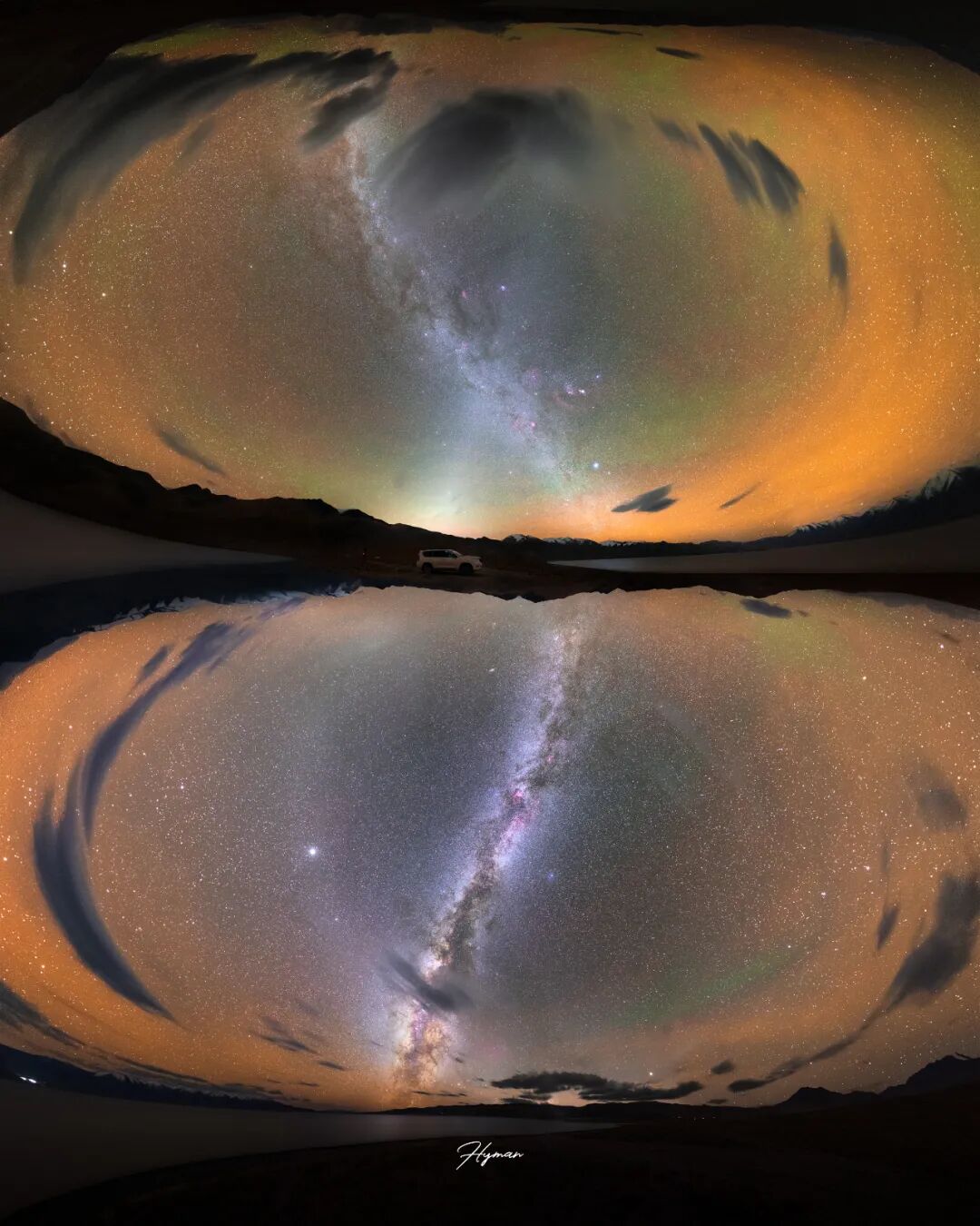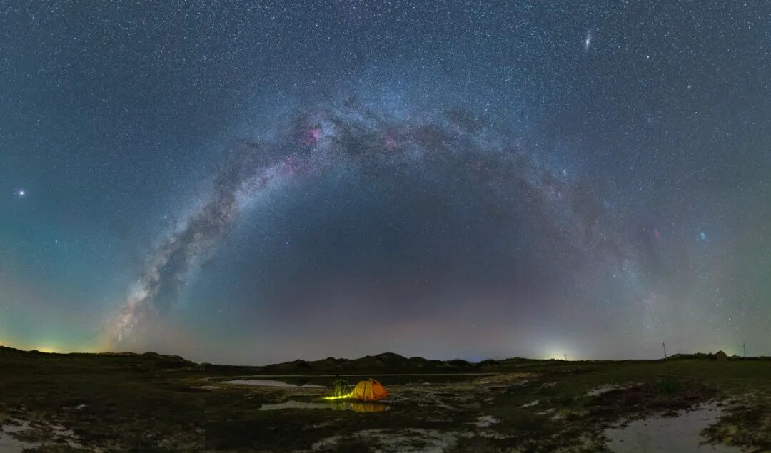 金秋十月,草原湖畔,当夜幕降临,西南到西北方向一道银河反拱桥横跨穹顶之上,跨度水平216度,俯仰超过90度,震撼如图。