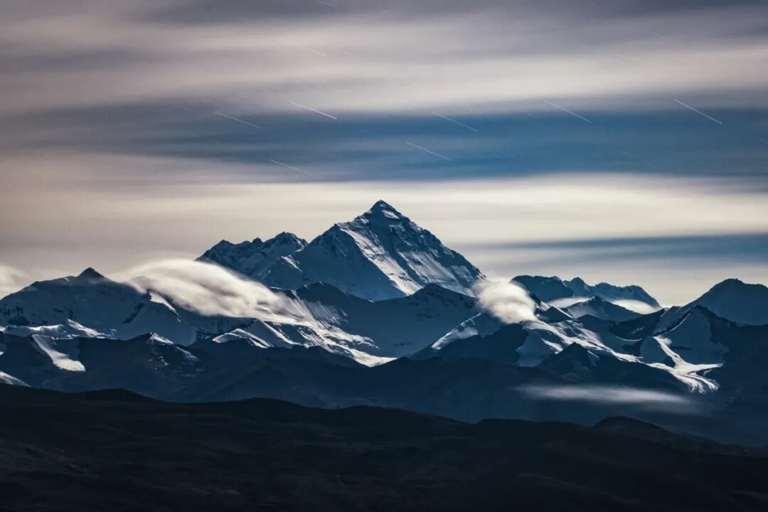终于到了心心念念的珠穆朗玛,没敢靠近,只在加乌拉山口的观景台上静静地欣赏着它那巍峨宏大、气势磅礴的体态,还有在它周围那群峰林立,山峦叠嶂的喜马拉雅雪山。那天晚上,农历初九的半月把皎洁光辉洒在洁白无瑕的主峰上,腰间白云萦绕,犹如圣洁的哈达披戴在伟岸的身躯之上。