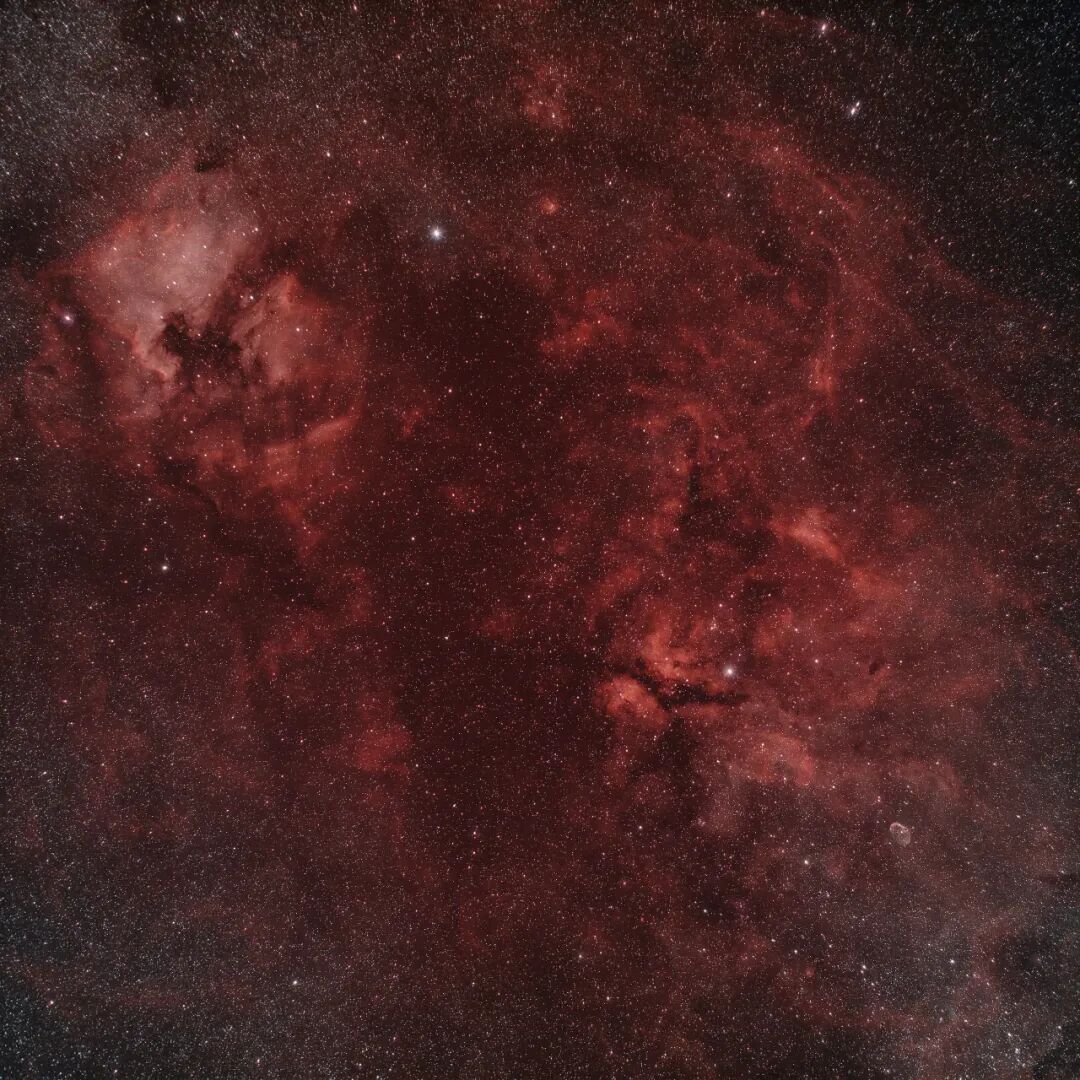 天鹅座尾部,有大量的红色发射星云,借助相机镜头得以使北美洲,鹈鹕与新月以及期间大量不知名的发射星云同框。