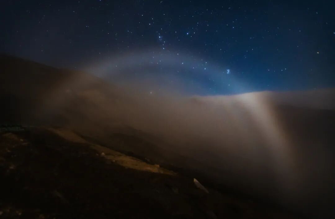 在海拔四千多米的川西北岷山之巅,夜晚来临之后,当月光照射在越过雪山的云瀑之上,出现了神奇的雾虹奇观。