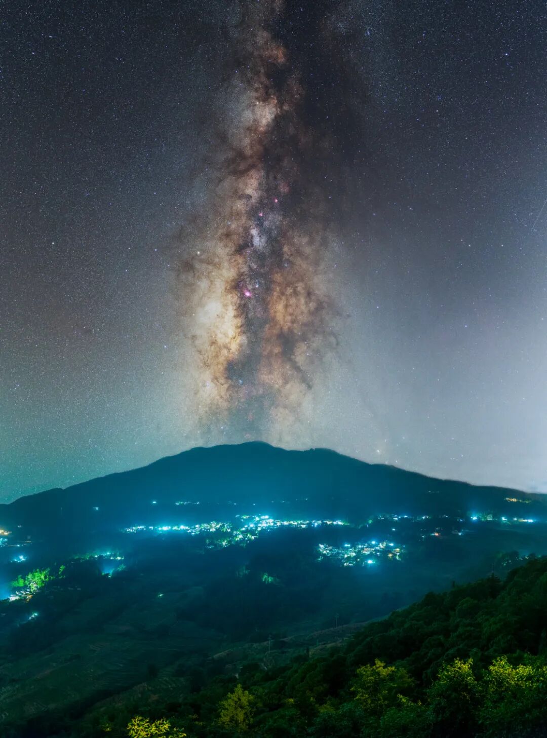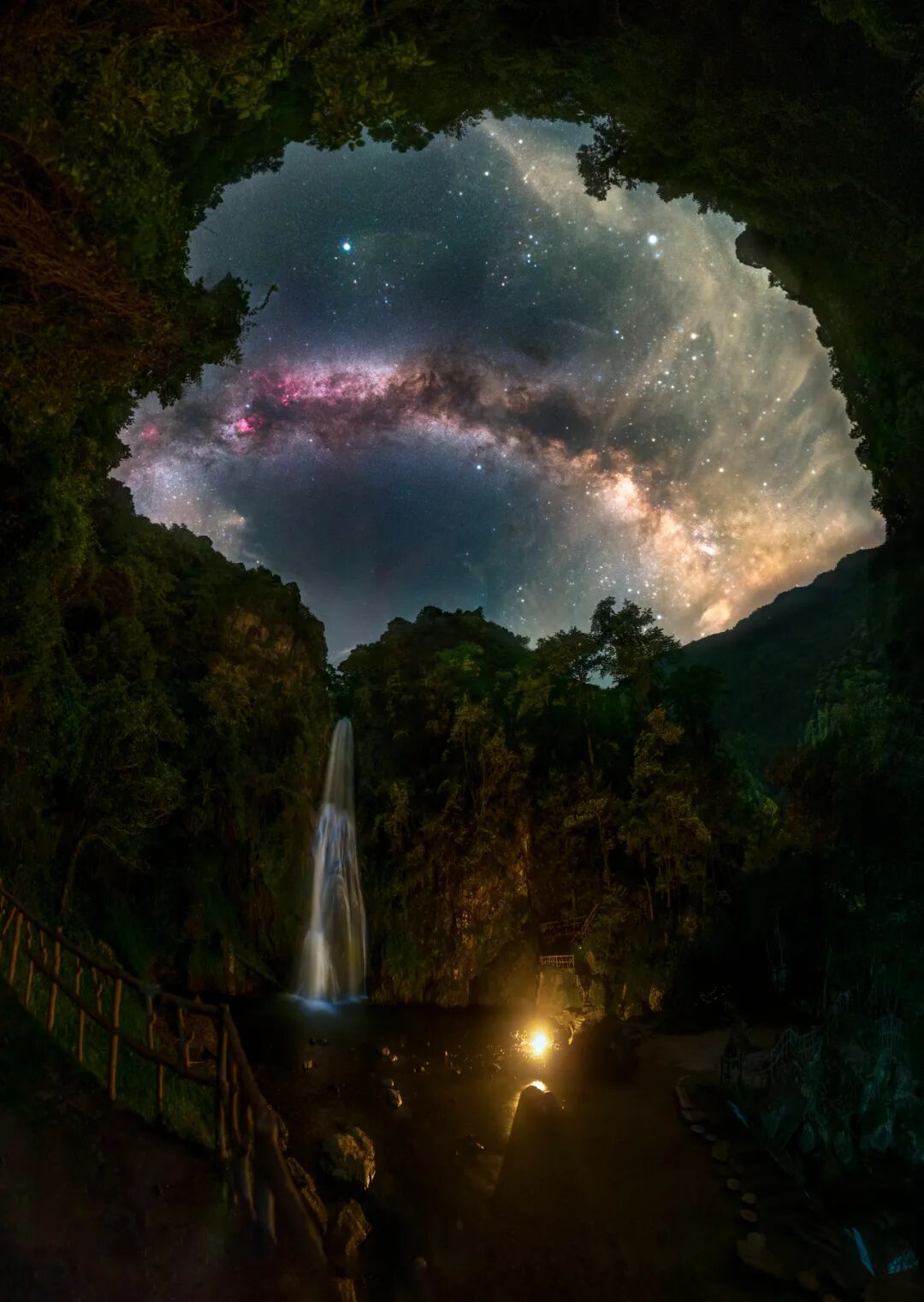 很早就想拍一张银河与瀑布同框的照片,终于在湖南省炎陵县的神农谷发现这么一条瀑布。这里地处湖南与江西交接的罗霄山脉之中,光污染程度很小,银河非常清晰明亮,河流从东方的悬崖上落下来形成了这条“珠帘瀑布”。夜晚的山谷非常黑暗,我只好用随身携带的灯光给地景人工补光,我不敢离瀑布太近以免相机被水流溅湿,于是在离瀑布较远的地方拍摄了这张全景图,瀑布如同从银河里流出来一样。