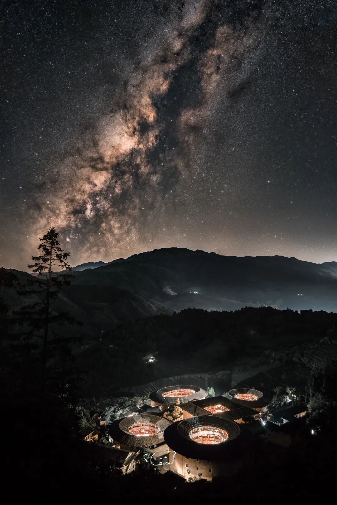 客家土楼,南靖田螺坑土楼颇有特点,被当地人戏称为“四菜一汤”。南靖田螺坑土楼按“金木水火土”五行相生次序建造。而五行理论即源于古人对日月五星等天体运行规律的观测和思考。《史记》曰:“天有五星,地有五行”。画面中的土楼与银河,不正是地上“五行”与天上群星的对话吗?