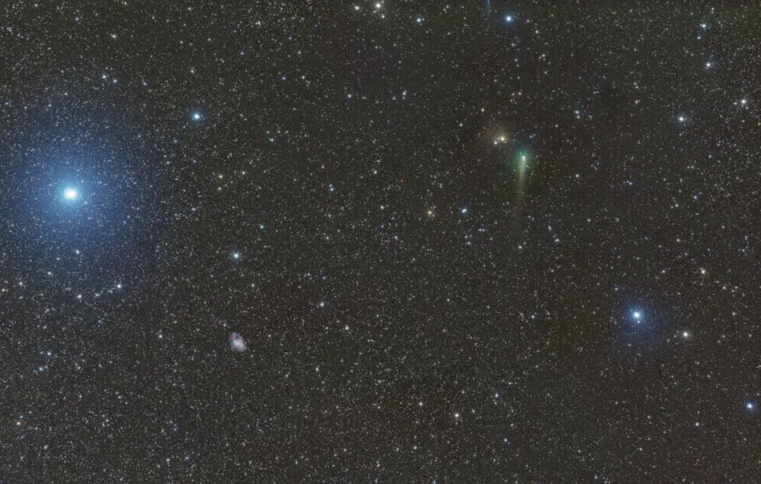 67P彗星是目前人类研究的最充分的彗星之一,2014年欧洲航天局发射的罗塞塔号探测器飞抵它并释放菲莱登陆器,它的轨道周期约为6.44年,下次回归就是2028年了。蟹状星云产生于1054年(北宋年间)爆发的一颗超新星,被称为“天关客星”(图片左上角的蓝色亮星为天关星)。巧合的是,蟹状星云的发现也与彗星有关。1758年,哈雷彗星回归,查尔斯·梅西耶在搜寻彗星的时候,意外发现了蟹状星云。宇宙总是充满巧合和惊喜,第一次用远程天文台尝试拍彗星,就碰到了如此奇观。一想到或许直到宇宙中所有的星星熄灭的那一天,这两颗天体都不会再这样排列,就倍感荣幸。