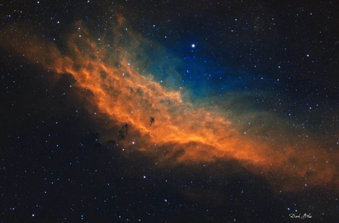 NGC 1499,这是一个大的弱发射星云,它被英仙座ζ的光所照亮。NGC 1499又叫加利福利亚星云.她的形状与加利福利亚州相似,故而得此名。比昴宿星团昏暗一些,因而更加难以辨认。这团红色的,正在膨胀的氢气距离我们约1,500光年。