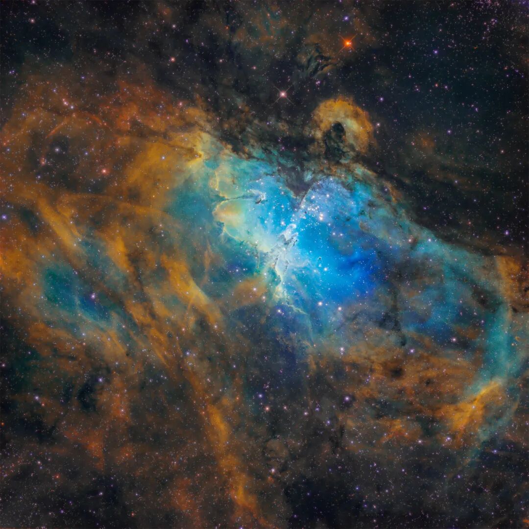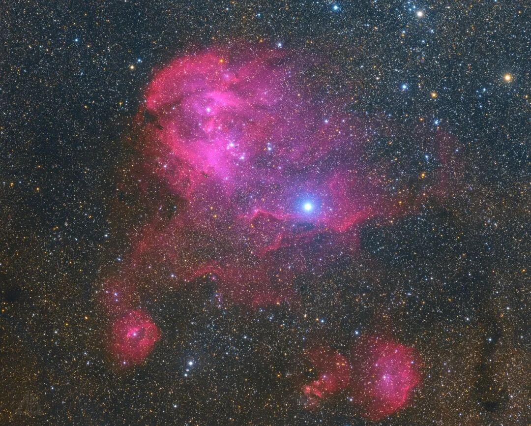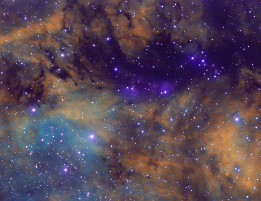 NGC6914,是位于天鹅座“心脏”部位的复杂星云结构,来自天鹅OB2星协的灼热年轻恒星发出强烈的的紫外辐射,使得该区域内的氢原子发生电离,同时星云中心部分的尘埃云也反射出来自恒星的光线,使得整片星云色彩极为绚丽。