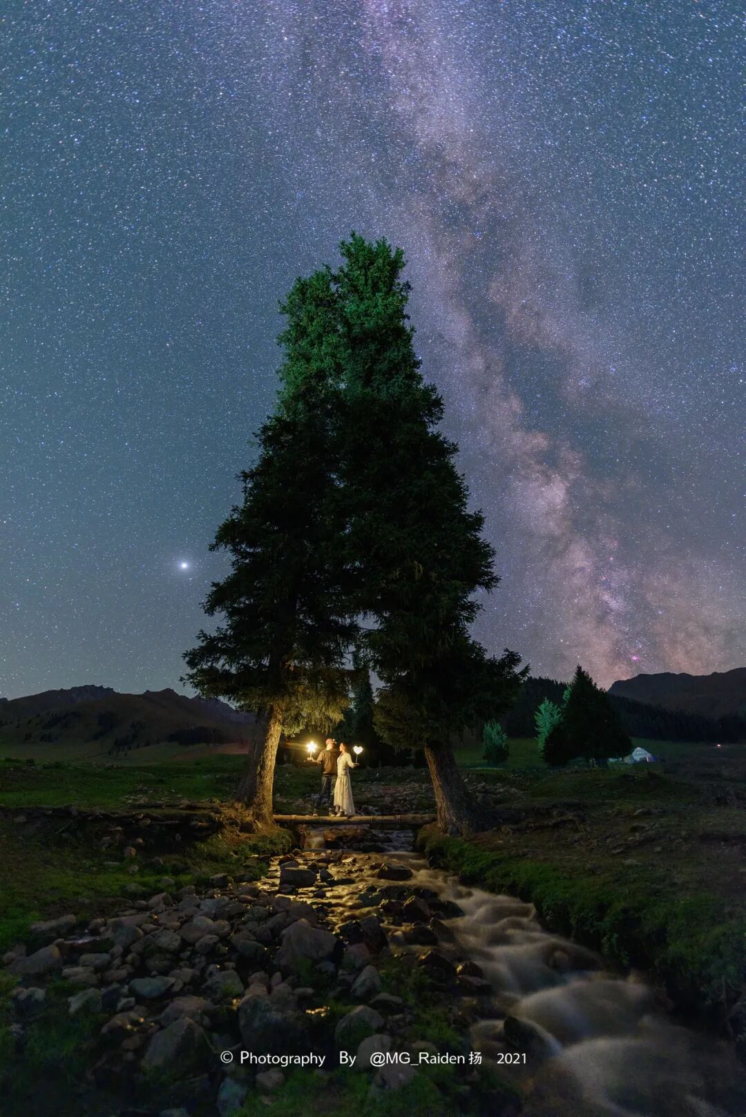 这个拍摄地点在那拉提空中草原景区游牧人家附近,因为有小溪、木桥、草原、森林而被称为“那拉提小瑞士”、“童话森林”。每到旺季,每天无数游客专程来打卡拍照。但是,晚上的景色是否也是那么美呢?答案是肯定的。我和夫人专程在那等候夜幕降临,算准了银河及木星合适的角度和时间进行拍摄。夜幕下的场景,更有童话世界的氛围了呢!