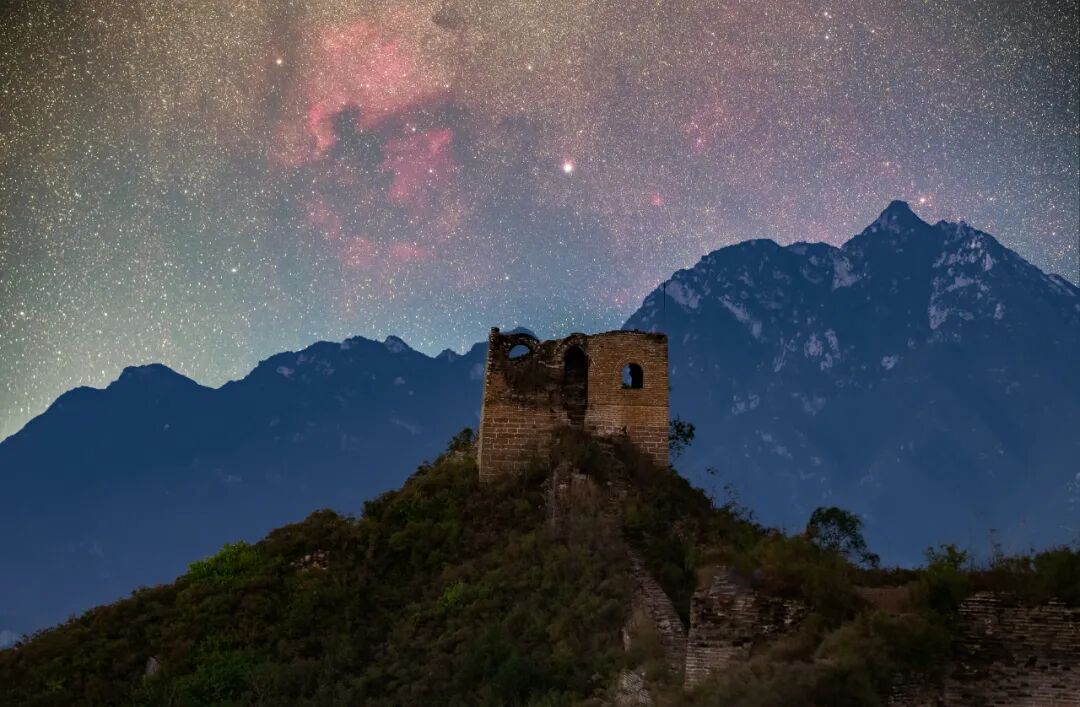 深夜,北美星云在长城背后悄悄落下。北美星云是一个距离我们1500光年的发射星云,并不能用肉眼直接观察。长城背后的群山挡住了古北口的灯光,也使得低空的星云能够显现出壮丽的形态。在天文改机的拍摄下,发射星云得以与长城同框,使得近处的长城,远处的群山,夜空中的星云共同呈现出这幅古人无法见证的画面。