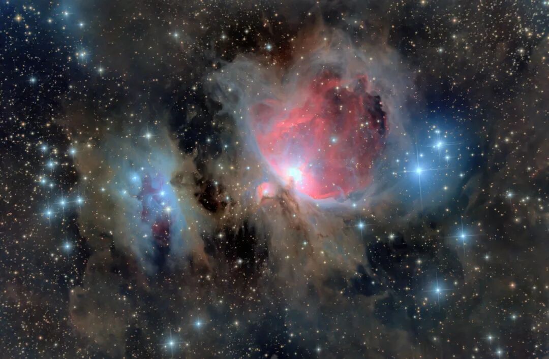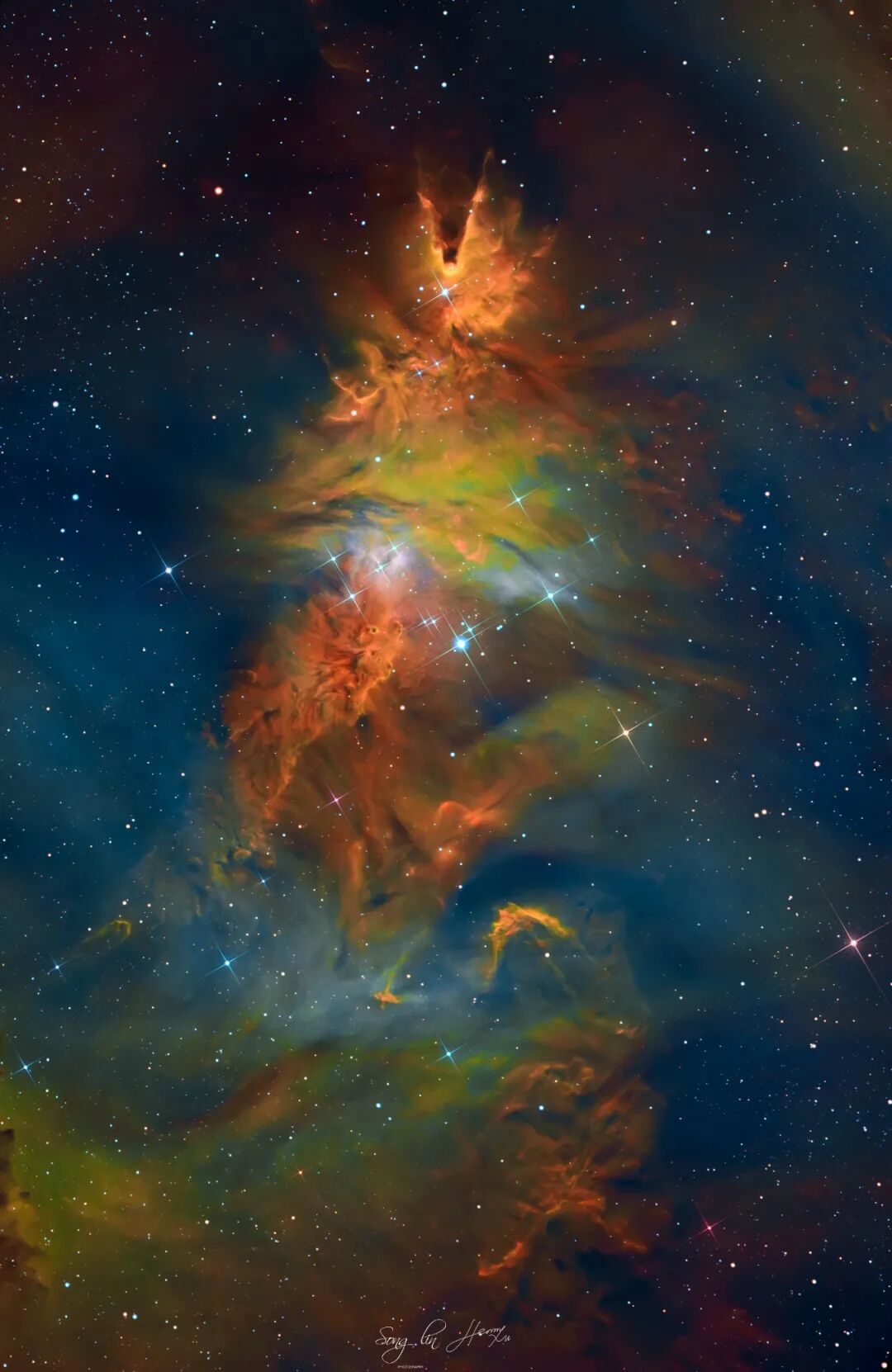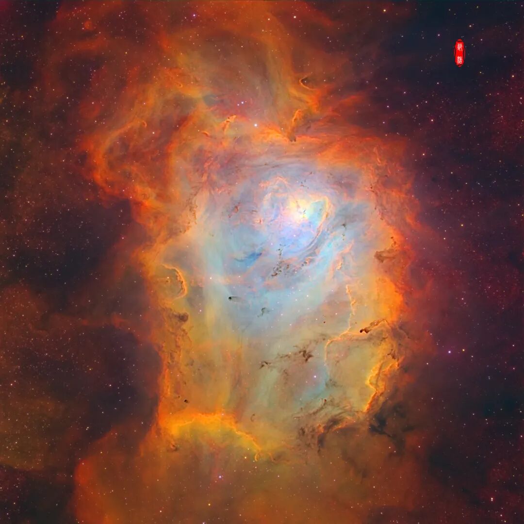 M8礁湖星云是个巨大的发射星云,不同物质激发态发光,在窄带下呈现绚丽的色彩。有人说它像个生蚝,我觉得他像一个人头的侧脸。银心区域的恒星特别多,本图进行了缩星处理以突出星云主体。