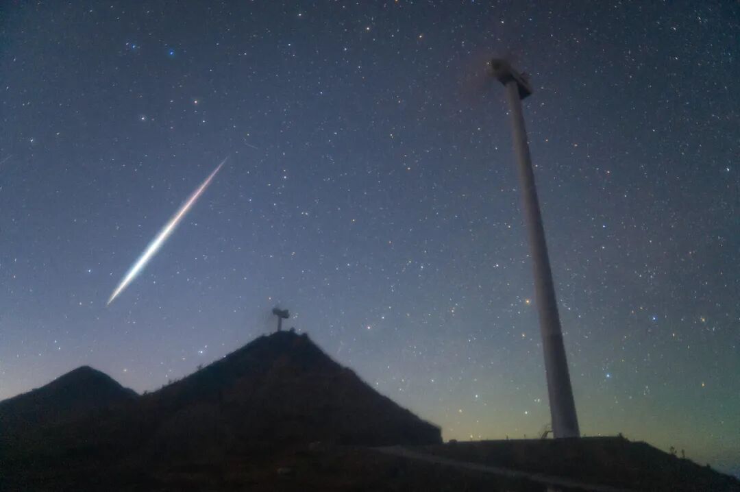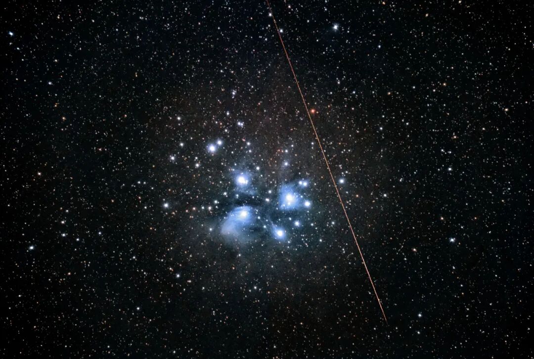 很惊艳,这是在长焦400mm焦段的画面中看到的双子座流星。双子座流星雨极大值之夜,在使用相机对昴宿星团累计曝光期间,有幸捕捉到了双子座流星划过M45昴宿星团的瞬间。