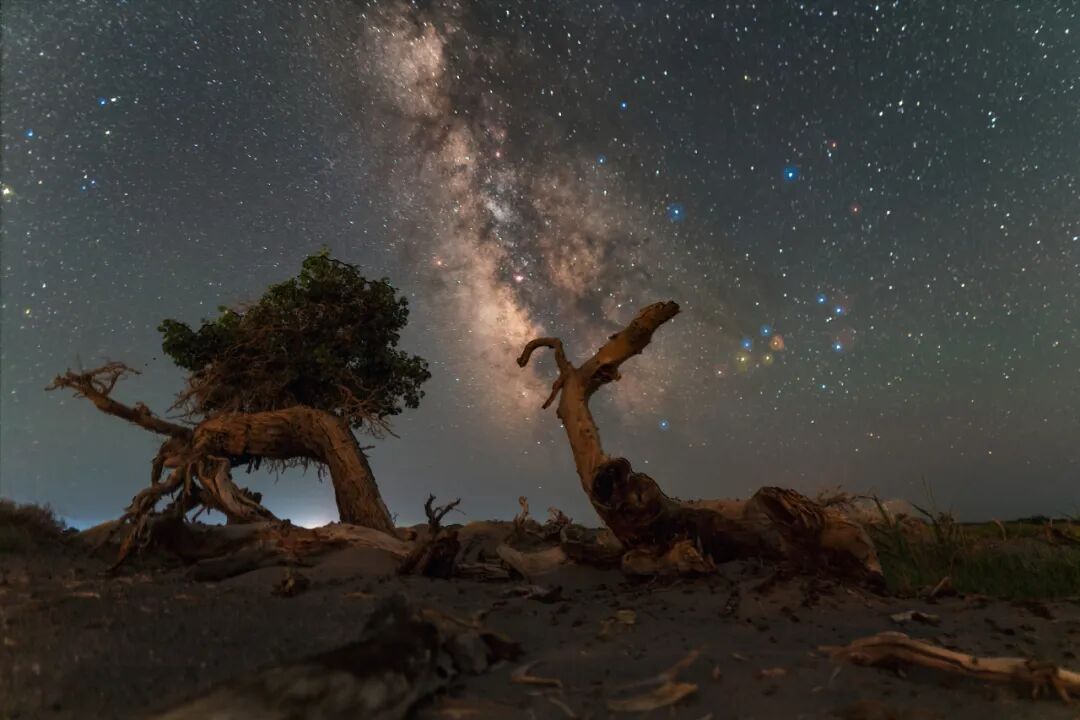 照片取景了地面的两棵胡杨树和银河。在广阔星空之下,无人之地的沙漠中只有几棵胡杨树呈现出扭曲的形状,仿佛垂暮的老者,又似负重前行的旅人,还似受尽生活磨练孤独忍耐的人。一棵棵横七竖八倒下的树干,仿佛倒下的尸体,散发生命与死亡的气息。远处的银河散发着来自几万年前的光芒,到达了胡杨树前,组成了这寂寥广阔的景色。