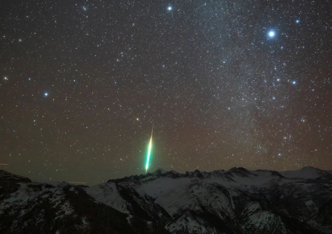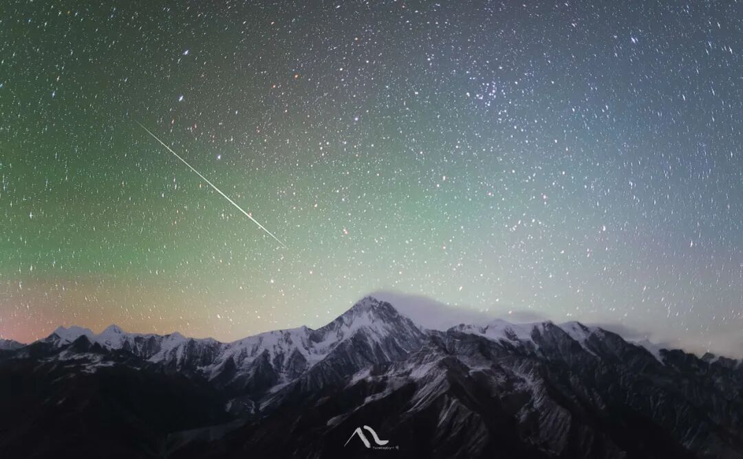 12月13日夜里,月落之后天色渐渐暗了下来,星光熠熠,冬季寒夜,狂风呼啸,遥望着贡嘎雪山,绿色和橙红色的气辉给天空增加了浪漫的色彩,一颗流星冲破大气层,飞向贡嘎雪山主峰,划破夜空,留下了长长的痕迹。