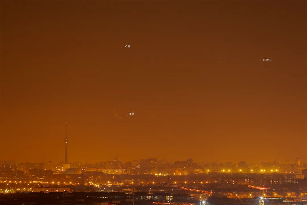 2022年1月1日清晨,火星与大火(心宿二)伴着一弯残月升起,在空中摆出一张有些偏的笑脸,迎接新一年的到来。雾霾的原因,心火伴月升到北京电视塔的高度才能被看到。