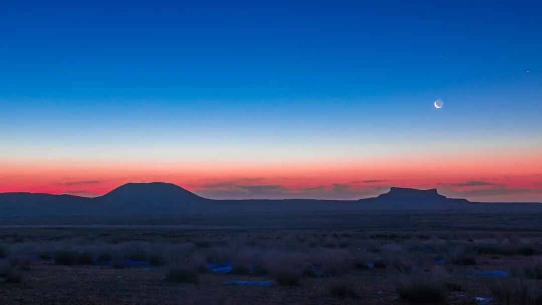 2022年新年第一天,早早来到乌兰哈达火山地址公园。在等待新年第一缕阳光到来之前,太阳的光芒早已映红了天际,月亮、火星、星宿二组成了一张笑脸,与我们共同笑迎2022年的第一缕阳光。
