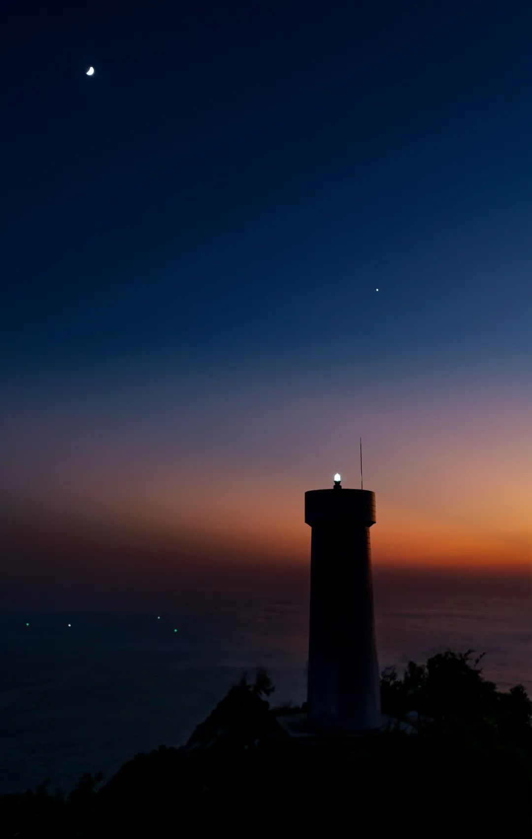 夕阳已沉入地平线,暮色渐浓。月牙高挂天际,金星在西方闪耀,海上的渔船也点起了盏盏灯火。山头的灯塔安静地屹立,那明亮的光芒为远方的航船指引着方向。