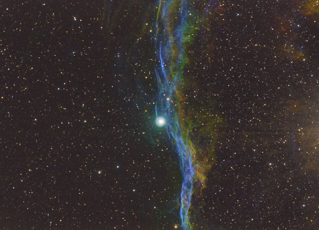 NGC 6960是西面纱星云(帷幕星云)的一部分,人们常叫它"巫婆扫帚星云",这个超新星爆炸的遗骸位于天鹅座方向,大约1400光年的远方,照片中央那一颗称为天鹅座52的蓝色亮星,在无光害的地方用肉眼可以观测到它。