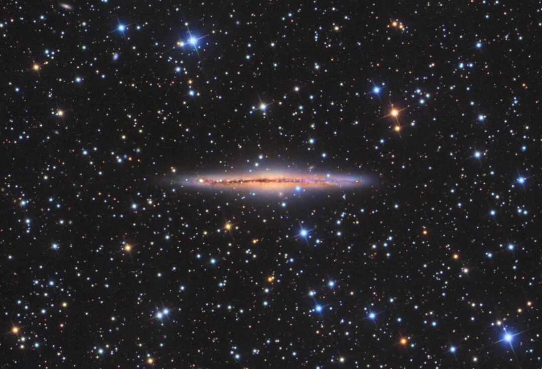 螺旋星系NGC891位于仙女座,离我们约有3千万光年远,大小约为10万光年。这个星系几乎是侧对着我们,外观与银河系相似。乍看之下,NGC891有个细扁的星系盘,并有数道尘埃云切过它鼓胀的核心。