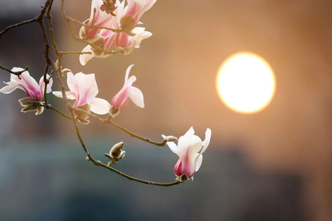 清晨,雾霾,暗淡的太阳从楼宇中升起,没有那么刺眼,调快快门速度,压低光线,利用相机闪光灯对焦点玉兰花补光,构图出一幅“太阳花”。