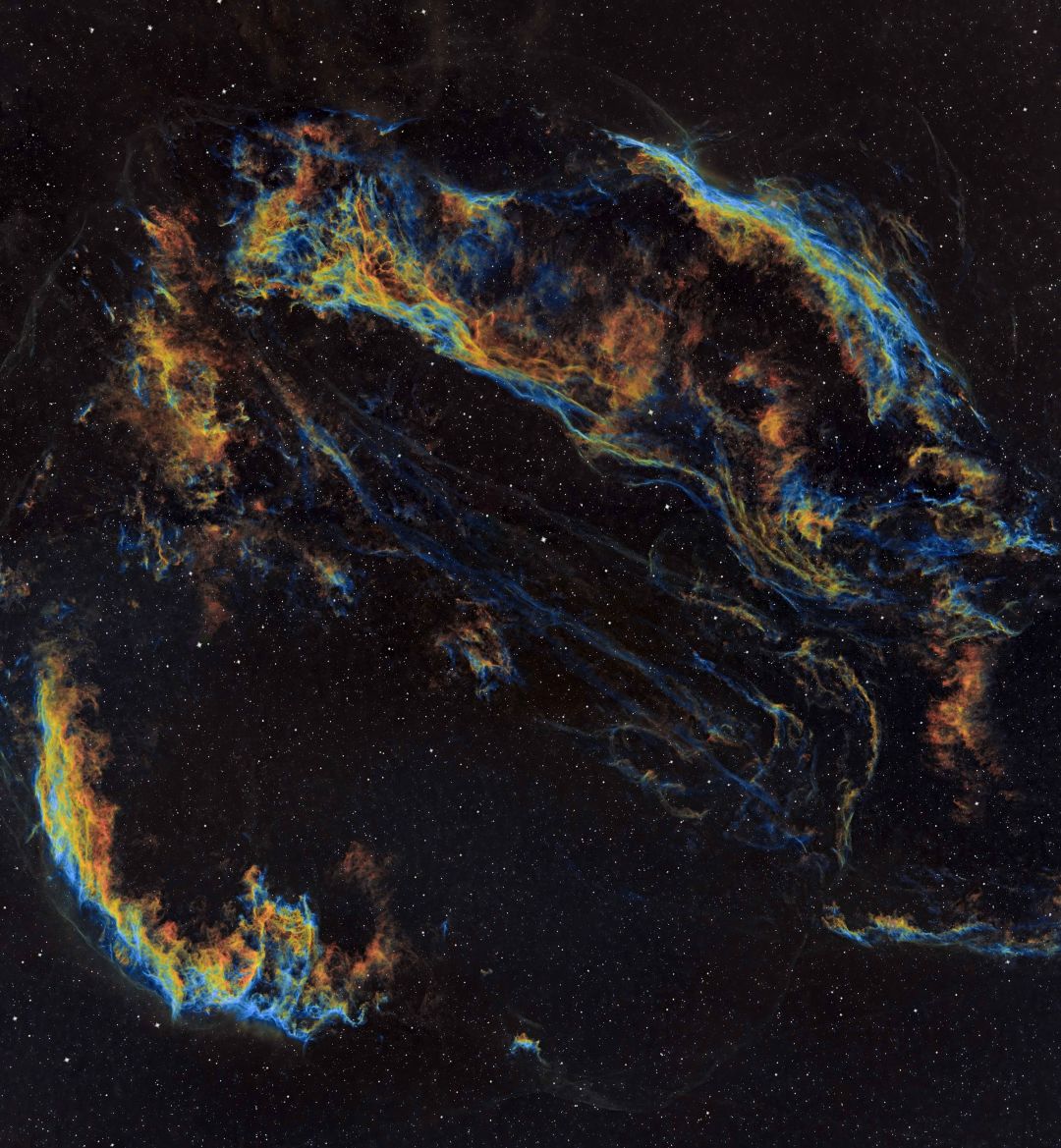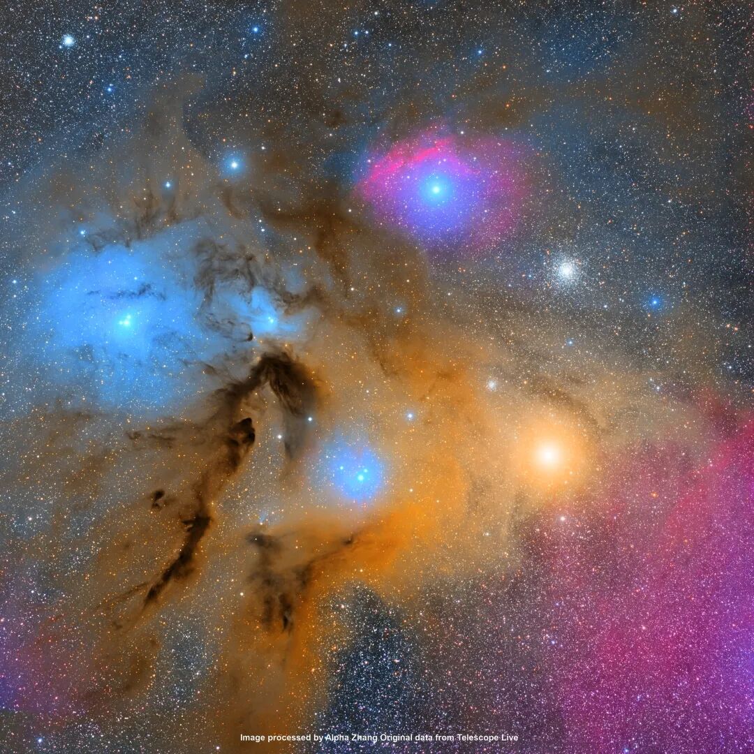 围绕着明亮的恒星心宿二、天蝎座阿尔法和蛇夫座 Rho,令人惊叹的星空展现出壮观的色彩,朦胧感与细节感交织在一起,给人前所未有的视觉冲击。蛇夫座 Rho 和附近的恒星沉浸在蓝色反射星云——主要由反射星光发光组成的尘埃云中。温度较低的超巨星心宿二(右下)本身正在脱落反映演化恒星淡黄色色调的物质。恒星形成区域的特征,来自氢元子的明显红色发射也渗透到视野中,以及可见的黑暗、模糊的尘埃云在背景星星和更亮的星云的剪影中。大约 500 光年外,蛇夫座 Rho 星云位于附近的球状星团M4的前方。