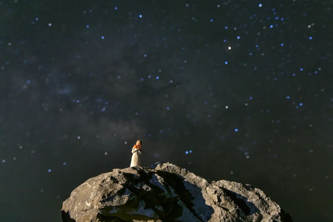 女神节的凌晨,冒着刀背梁的大风和寒冷,我们合作完成了此图:春季银河缓缓升起,星星闪耀在头顶,手捧鲜花的少女被来自宇宙的辉光笼罩和祝福。以此献给天下所有的姐妹:世界以痛吻你,你却报之以歌,祝你温柔且强大,幸福又安宁,爱生活,更爱自由,你既是生命的摇篮,也是世界的中心。