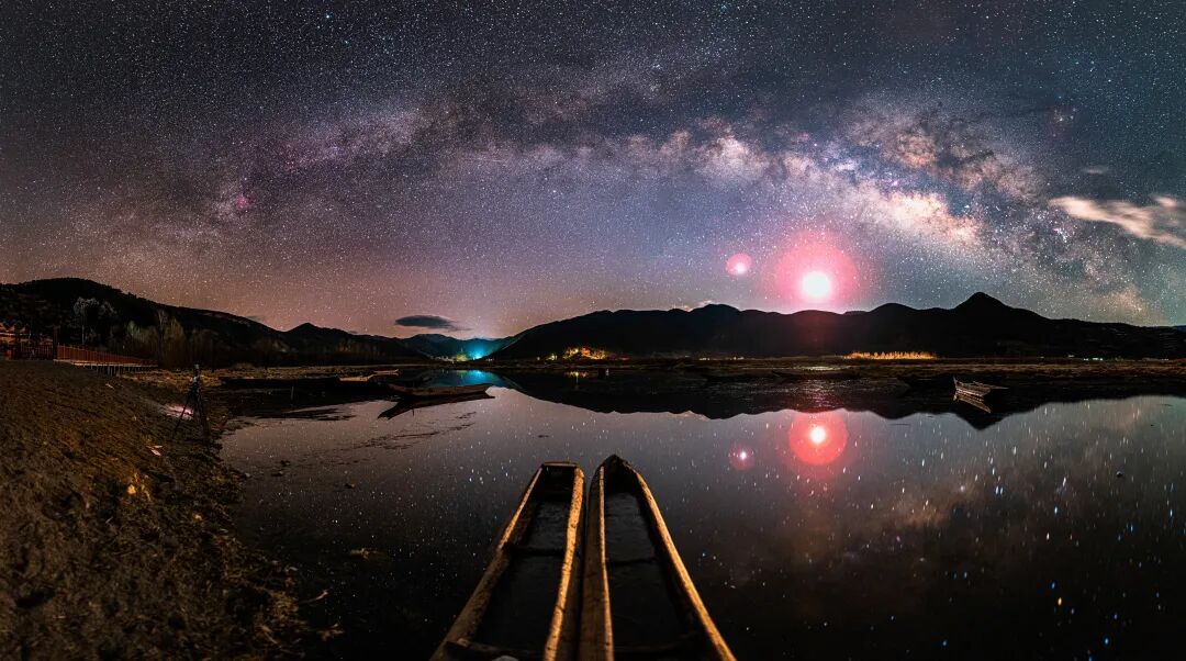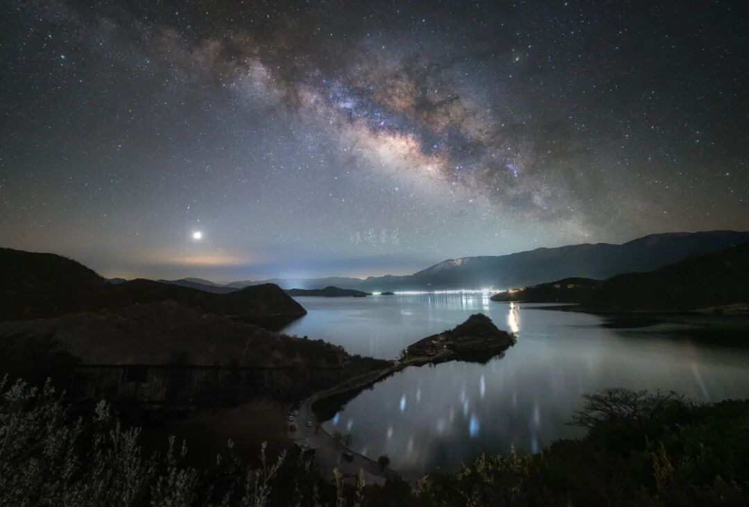 时隔一年再次来到了泸沽湖,这次的目的地是草海的一处码头。到达后我们一行人架好相机从入夜一直等到凌晨时分,银心与月亮、金星从远处山头升起,同时在水中映衬出倒影,显得格外美丽。