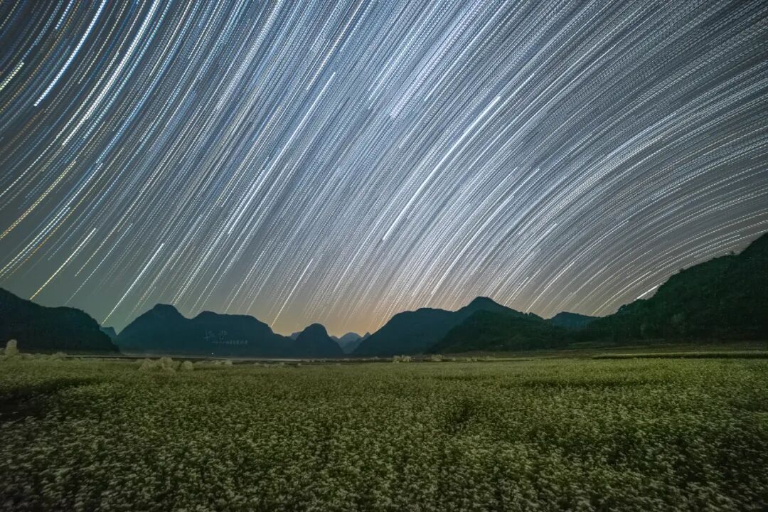 枯水期的独山水库边上,白色的荞麦花迎寒而开。放眼望去,一大片白茫茫的花海随风摆动,远处连绵不绝的群山层峦交错,这便是广西独特的喀斯特地貌。荞麦花也被叫做恋人花,它的花语是恋人,荞麦花之上,斗转星移,仿佛恋人相守一生的誓言,跨越时间,不曾更改。