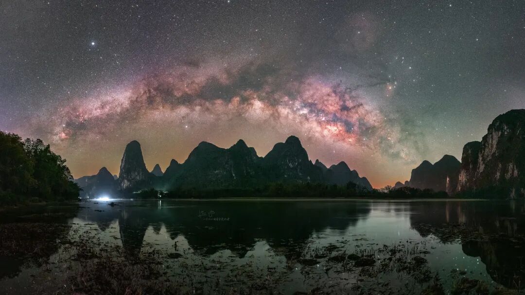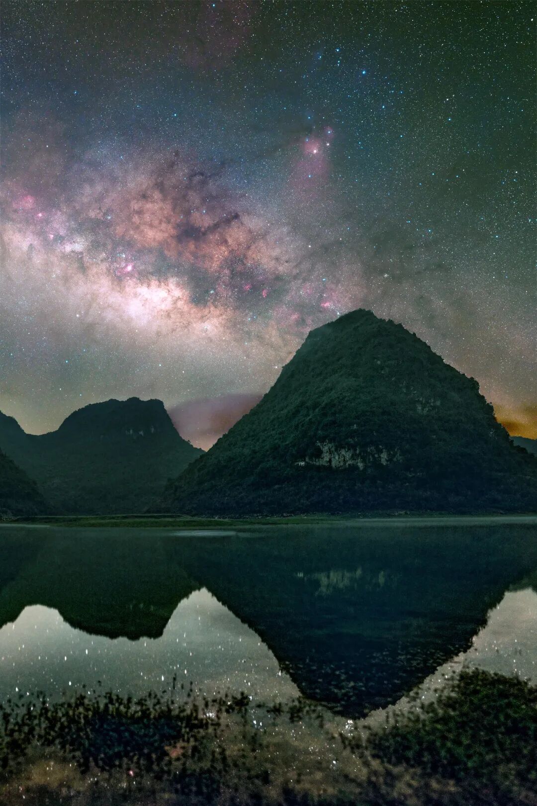 近半个月来广西一直在阴雨中度过,看了云图预报,感觉女神节这天有很大机率可以拍到星空,果断跟着朋友驱车直达阳朔县的漓江边上蹲守凌晨的银河升起。刚下完雨放晴,天空通透度相当不错,喀斯特的独特地貌与绝美的银河相互交映,搭配水面淡淡的星空倒影,好似一幅水墨画卷。