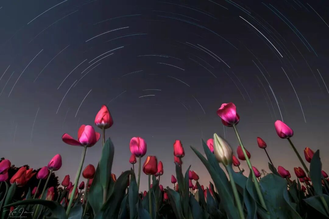 最近植物园的郁金香开了,便萌生了拍摄一组夜空下的郁金香的想法。由于植株比较矮,市区光害非常大,所以只能靠近低机位拍摄星轨,为了避免前后景深过大造成虚焦,便通过拍摄几组不同焦点进行景深合成保证画面清晰。