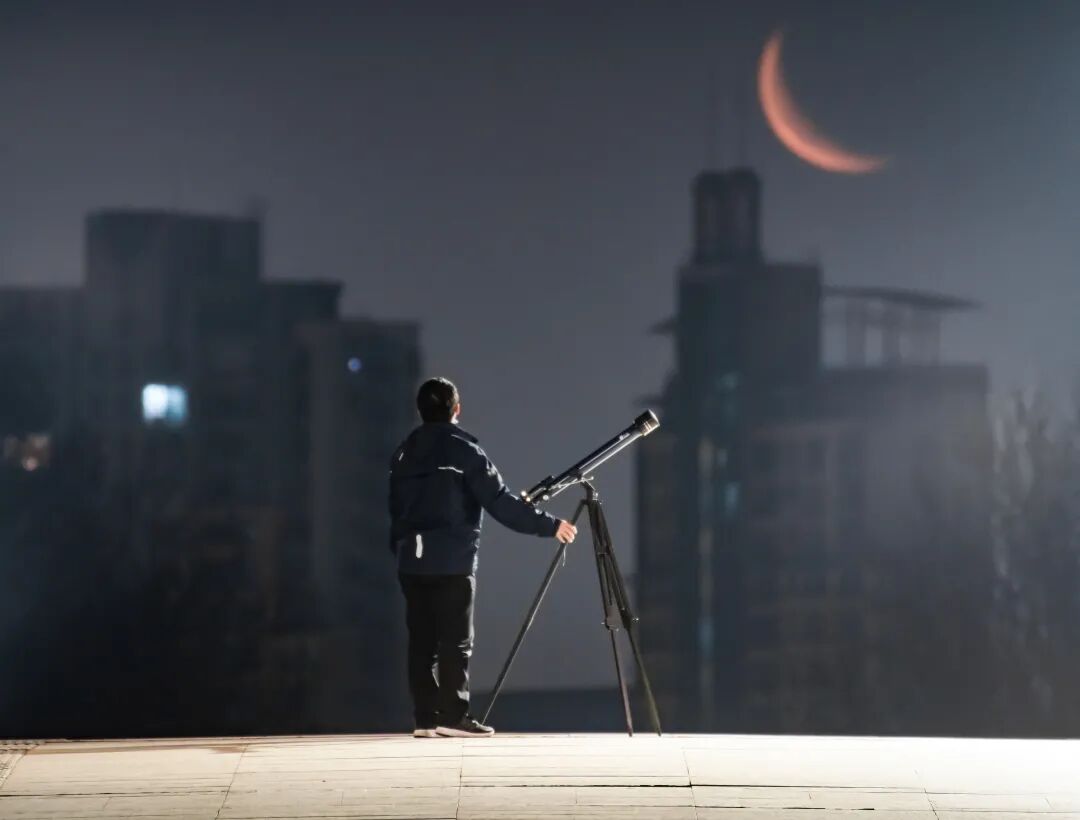 凌晨,只有一个人拍,设置好相机间隔拍摄后,跑到站位。一轮弯月缓缓从地平霾中升起,淡淡的古铜色,高度角为3-4度,目视下若隐若现。