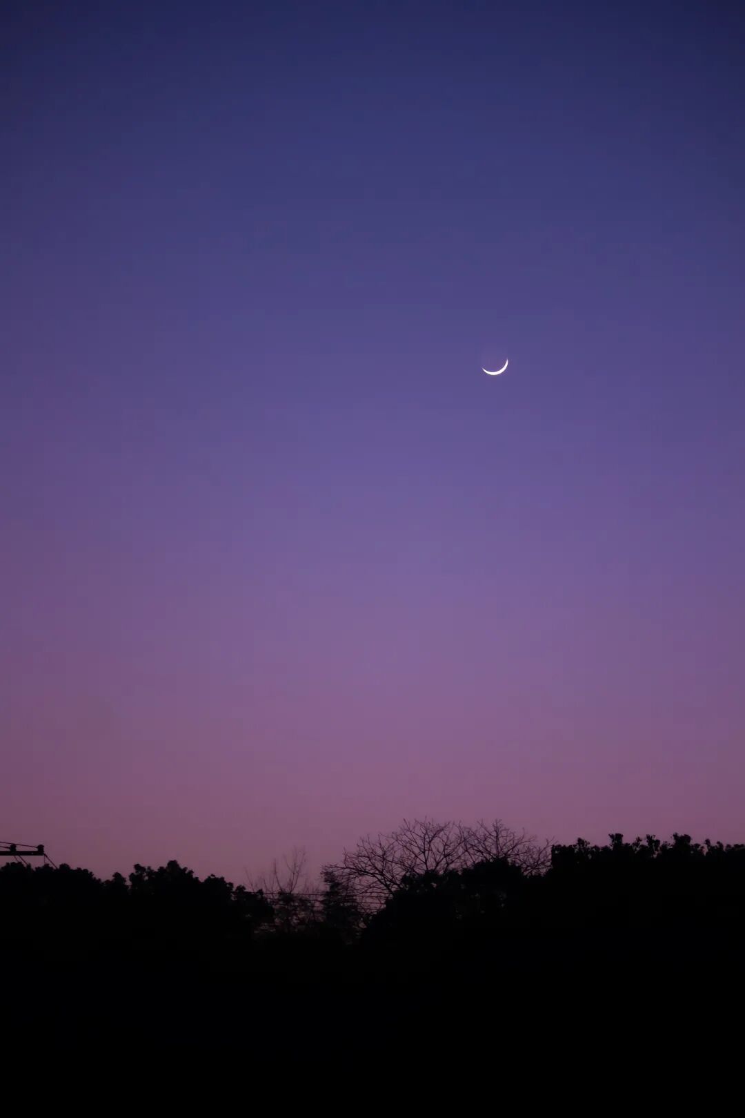 农历正月初三的傍晚拍下的峨眉月,弯弯的小月牙依偎在暮色的晚霞中,似夜幕降临前归家的孩童。