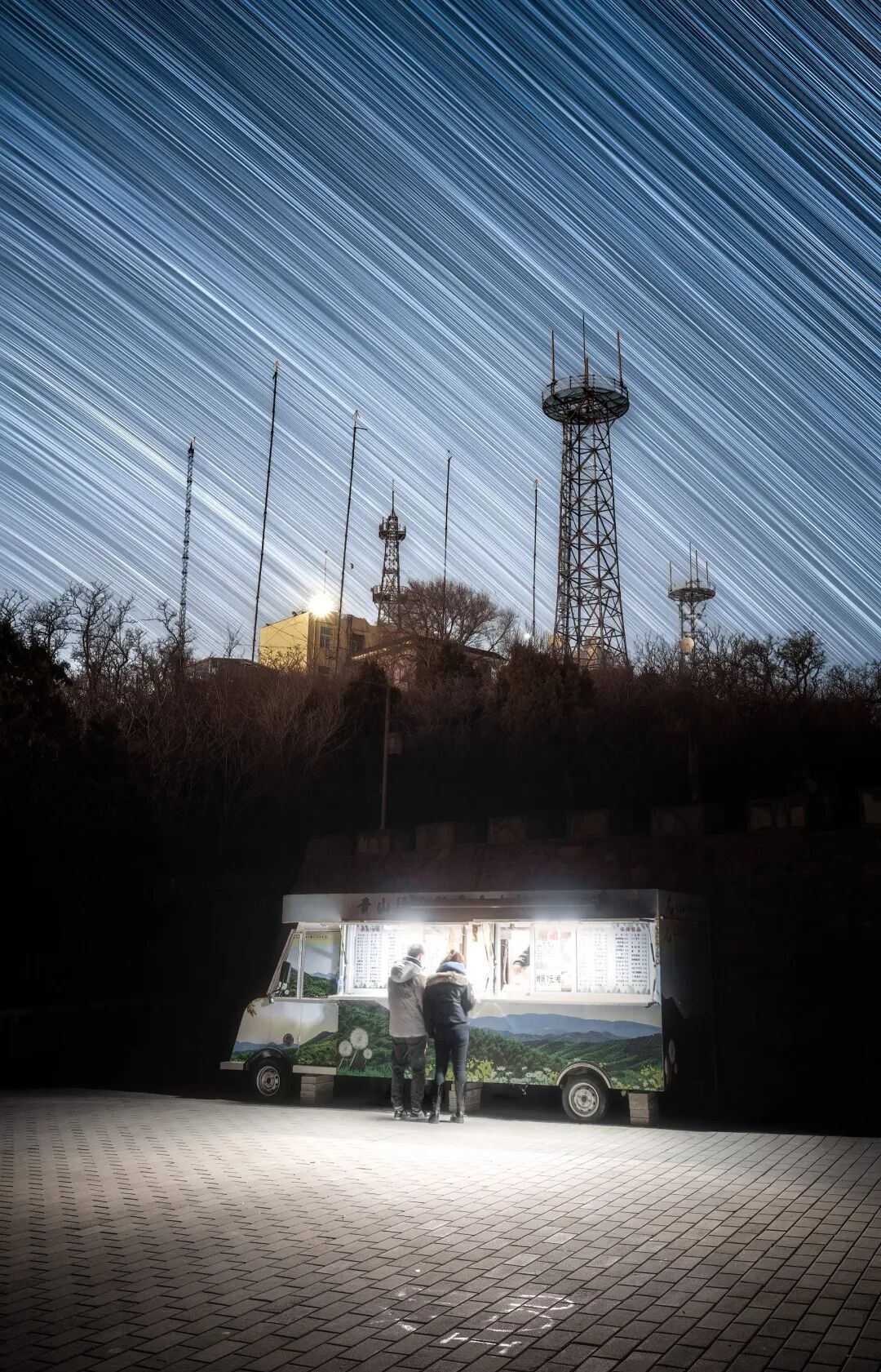 到了周末,鬼笑石景区人山人海,大家来这里享受居高临下赏京城的感觉,而我和伙伴们则是等到夜深人静,灯光渐暗时拍摄帝都上空的星轨。完成拍摄目标后,景区内的游客依然络绎不绝,我注意到餐车的光线很美,和星轨同框一定很好看,然而这还不够,我还需要一位或者一对主角。于是我架好相机,抓拍到一对情侣前去买东西的画面,后期单独把这张地景合成进堆栈好的星轨里,一张浪漫星轨作品就诞生了~